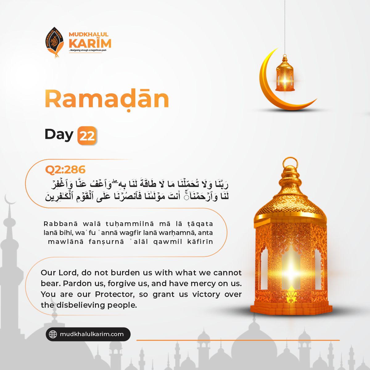 On the twenty-second day of Ramaḍān, we are reminded of Allāh's mercy and justice that He does not burden a soul beyond what it can bear. This verse is a heartfelt plea for relief from overwhelming trials, asking Allāh to forgive, pardon, and have mercy on us. We also seek His support and victory over those who oppose truth and justice. It is a prayer of surrender, trusting in Allāh's wisdom and kindness while asking for strength to face challenges with patience and faith. Today, ask Allāh to lighten your burdens, forgive your mistakes, shower His mercy upon you, and grant you triumph over difficulties. May He fill your heart with peace.