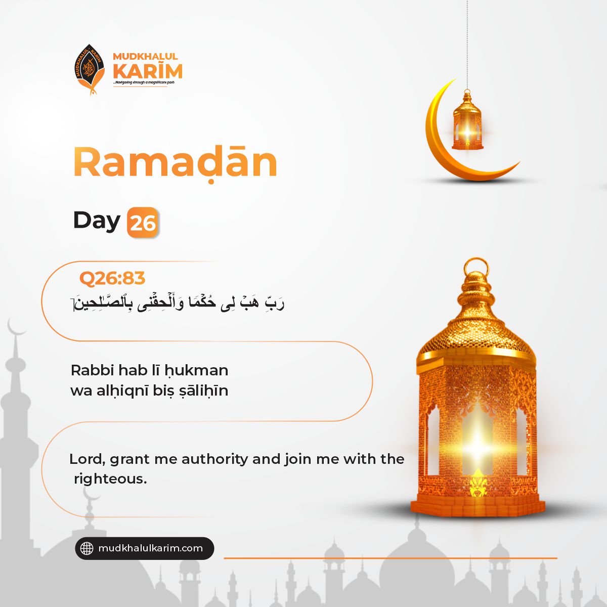 On the twenty-sixth day of Ramaḍān, we seek the wisdom and righteous company that lead us on the best path. This verse is a heartfelt prayer asking Allāh to grant us authority, the ability to judge rightly, understand deeply, act with insight and to join us with the righteous who inspire goodness and guide with virtue. Today, reflect on the importance of wisdom in your life and ask Allāh to increase you in knowledge, good judgment, and to surround you with those whose faith and actions elevate you. May Allāh bless you with wisdom and fellowship that strengthens your faith and character. Āmīn.