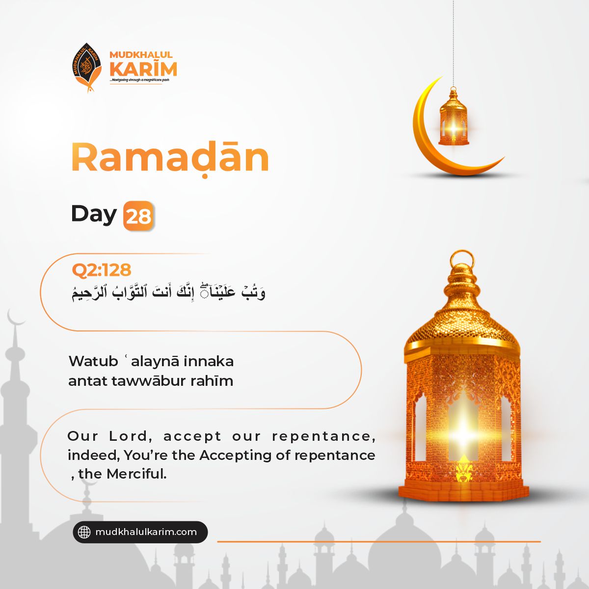 Ramaḍān day 28 centers on the essence of tawbah (repentance). This is a short prayer but deeply powerful verse, it reminds us that Allāh is At-Tawwāb (The One who constantly accepts repentance) and Ar-Raḥīm (The Most Merciful). No matter how often we fall, His door remains open. This duʿā’ was made by Prophet Ibrāhīm (AS) and his son prophet Ismā’īl (AS), showing us that even the greatest of believers continuously sought Allāh's mercy and forgiveness. Tonight, return to Him again, not just for past sins, but for every time you turned away, delayed prayer, lost focus, or forgot your purpose. Ask Him to accept your repentance, purify your heart, and draw you nearer to Him in the days to come. May Allāh turn to us in forgiveness, envelop us in His mercy, and write us among those whose repentance is accepted. Āmīn.