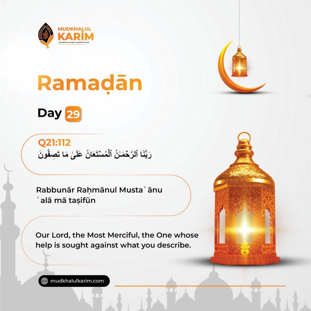 As the blessed month of Ramaḍān nears its end, Day 29 reminds us of who Allāh is, Ar-Raḥmān (the Entirely Merciful), and Al-Mustaʿān (the One we seek for help) in all matters. This verse was spoken by Prophet Muḥammad, in response to the denial and accusations of disbelievers. Instead of responding with anger, the Prophet placed his full trust in Allāh mercy and assistance, teaching us the most powerful way to handle hardship with faith and surrender. On this final stretch of Ramaḍān, place your trust in Ar-Raḥmān for whatever lies ahead. Seek His help against all worries, trials, or injustice. He is the Helper when words fall short, and His mercy covers every pain. May Allāh be your source of strength, help, and peace in all that you face. May He accept your Ramaḍān and carry you forward with light and faith. Āmīn.