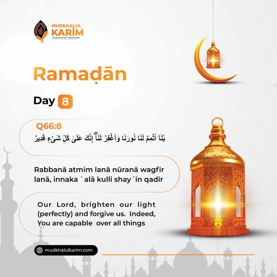 The eighth day of Ramaḍān is a reminder of the divine light that Allāh places in the hearts of the believers. This light guides, protects, and strengthens us especially in moments when the world feels dark or uncertain. Today is a day to ask Allāh to complete that light within you, the light of faith, the light of guidance, the light that leads to His pleasure. Seek from Him a heart illuminated with clarity and forgiveness that erases every past mistakes. For Allāh is capable of perfecting every goodness in your life. May He brighten our hearts, forgive our shortcomings, and lead us toward His mercy. Āmīn.
